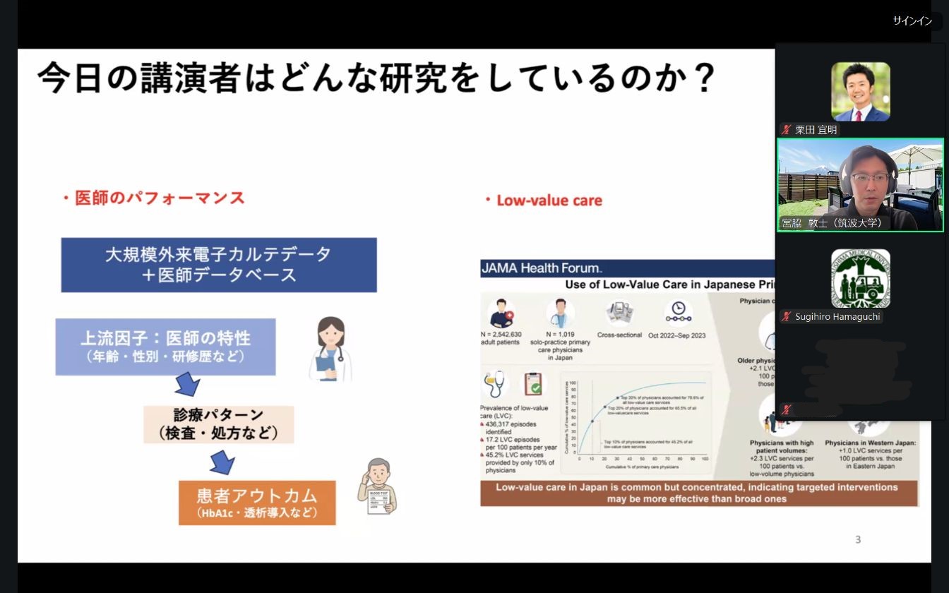 宮脇敦士先生のランチョンセミナーでは、学生時代から大学院進学、海外留学、そして現在の教職員としての歩みに至るまでのキャリア選択について、当時の考えや経験を交えながらお話しいただきました。さらに、公衆衛生と医療政策が交わる領域における研究活動についても、具体的な事例を中心にご紹介いただきました。